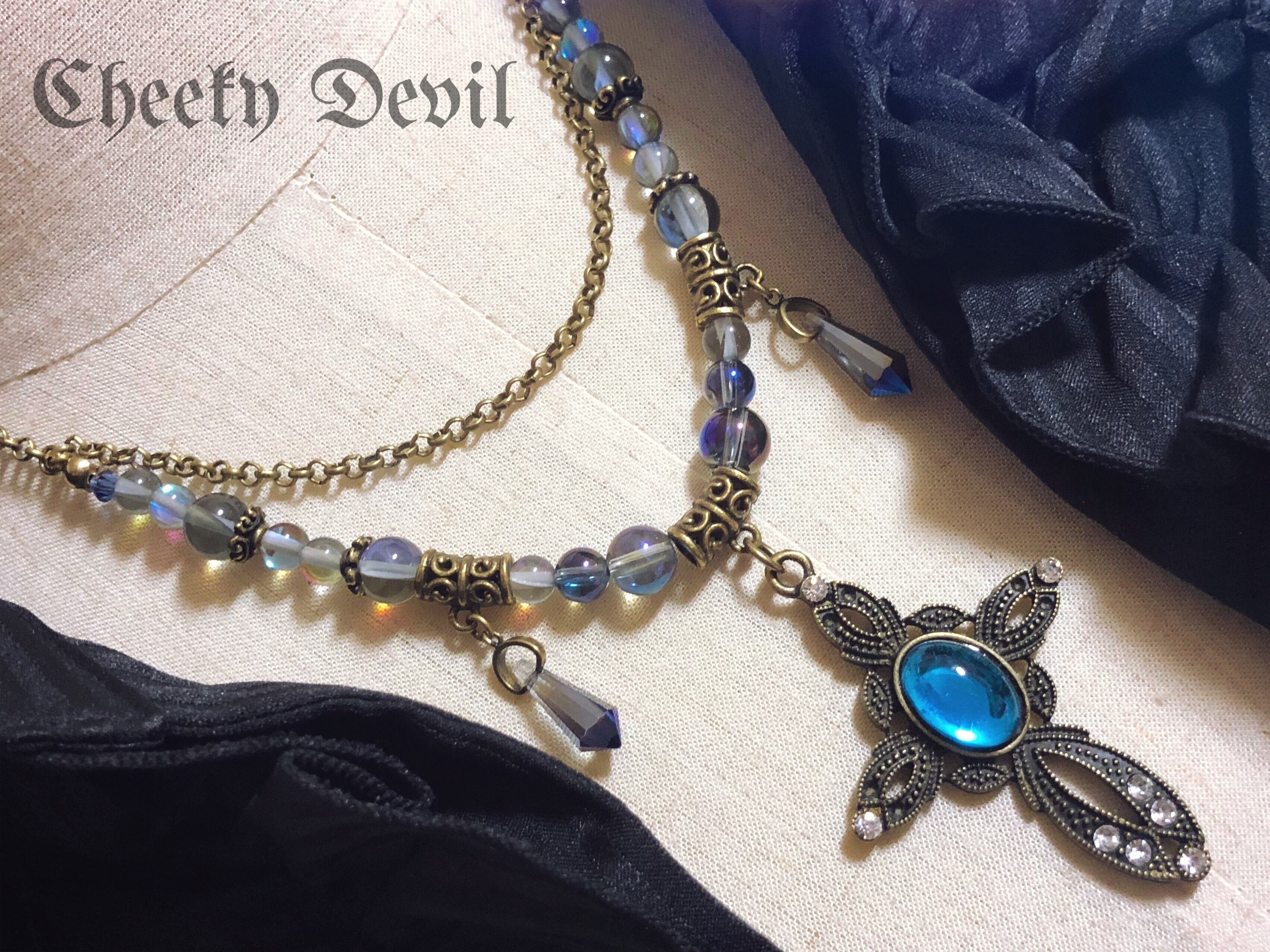 オーラ水晶とルナフラッシュガラスが神秘的な光を放つヴィクトリアン調のクールなペンダント。.。:+*